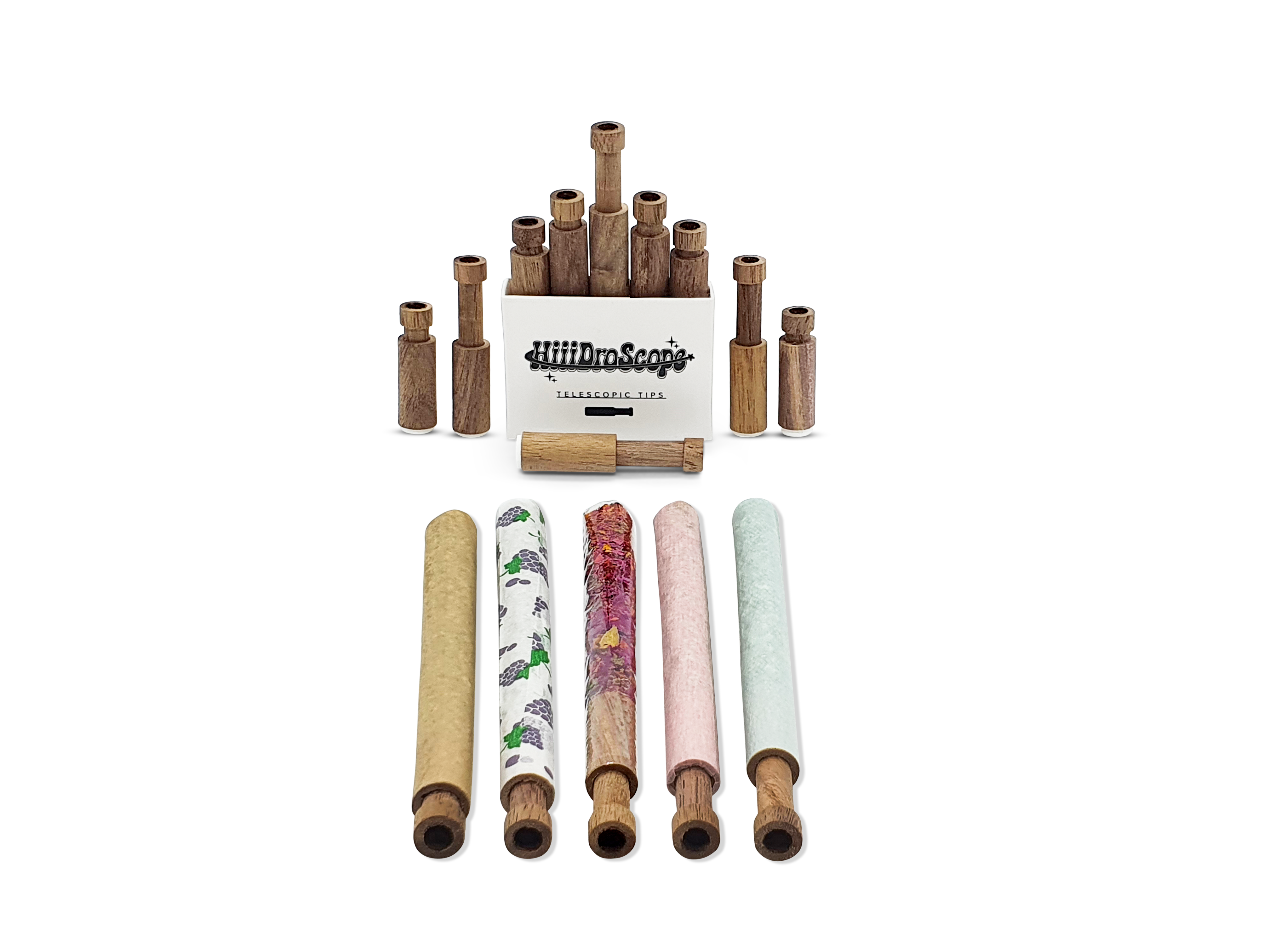 The HiiiDroScope is an innovative and practical solution for joint enthusiasts. This reusable telescopic filter features a wooden body with an expandable and retractable design, topped with a ceramic tip, serving as a filter and holder for your joints. Its unique design offers several remarkable benefits: